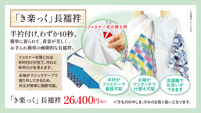 半衿付けわずか10秒。簡単に着られて着姿が美しく、お手入れ簡単の長襦袢を特別価格にてご提供いたします。※受注販売のため、ご注文後のキャンセル・変更はできません。詳しくは店舗スタッフまでお問合せください。※「きもののやしま」のみのお取り扱いとなります。