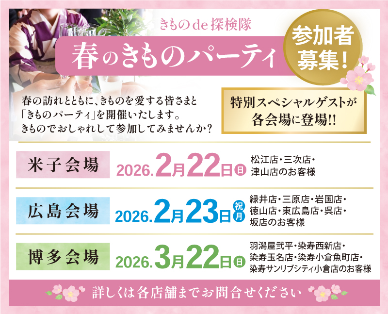 [米子会場]2026年2月22日(日)⇒松江店・三次店・津山店のお客様[広島会場]2026年2月23日(月・祝)⇒緑井店・三原店・岩国店・徳山店・東広島店・呉店・坂店のお客様[博多会場]2026年3月22日(日)⇒羽潟屋弐平・染寿 西新店・染寿 玉名店・染寿 小倉魚町店・染寿 サンリブシティ小倉店のお客様