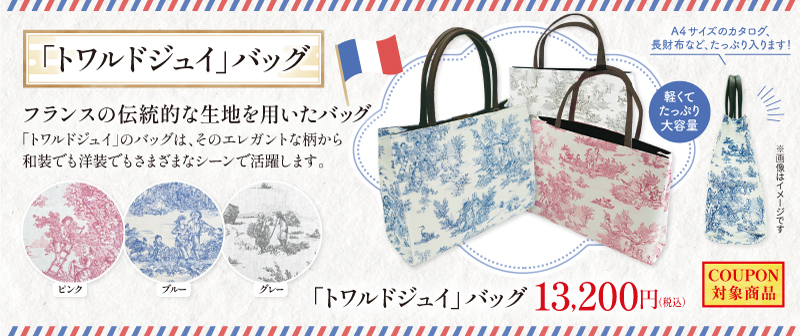 フランスの伝統的な生地を用いた「トワルドジュイ」のバッグは、そのエレガントな柄から和装でも洋装でもさまざまなシーンで活躍します。