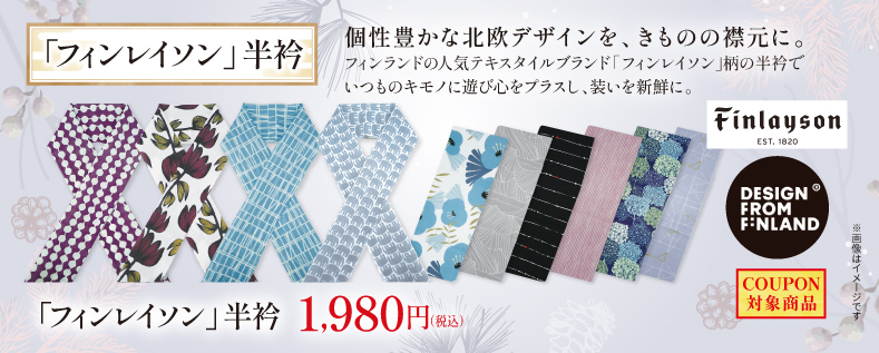 フィンランドの人気テキスタイルブランド「フィンレイソン」柄の半衿を取り揃えました。いつものキモノの襟元に遊び心をプラスし、装いを新鮮に。