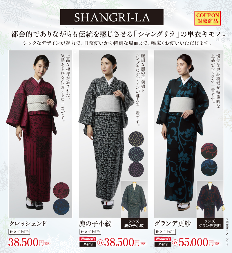 都会的でありながらも伝統を感じさせる「シャングリラ」の単衣キモノ。シックなデザインが魅力で、日常使いから特別な場面まで、幅広くお使いいただけます。