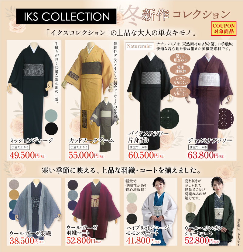 「イクスコレクション」から、上品で大人の気品漂う単衣キモノや羽織・コートが揃いました。この冬を彩る、洗練の新作をご紹介します。