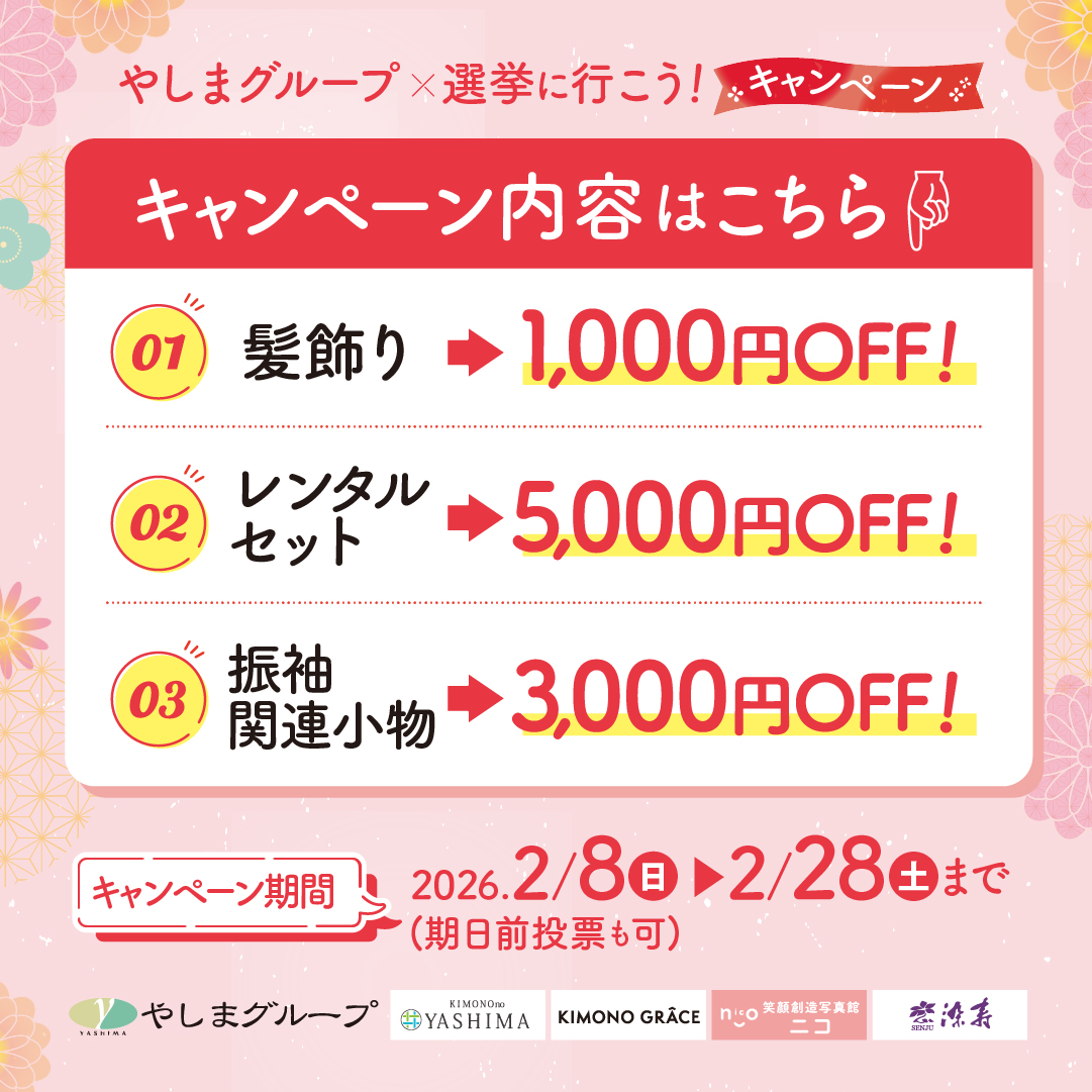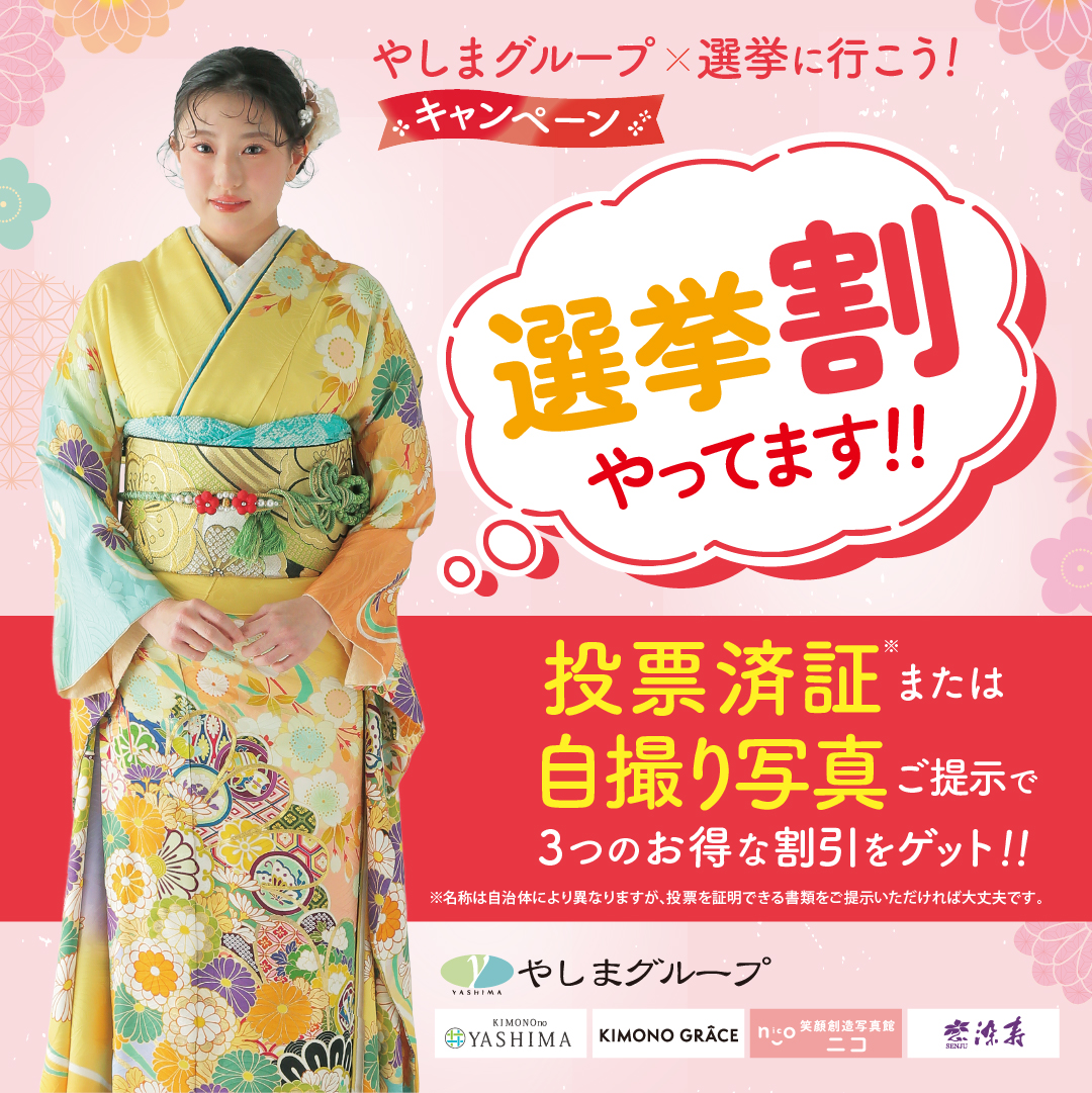 未来を選ぶあなたへ、やしまグループからの贈り物。私たちは、社会の一員として一歩を踏み出す若い世代の皆様を応援しています。 投票に行くと、成人式や卒業式の準備、夏の思い出作りに役立つ