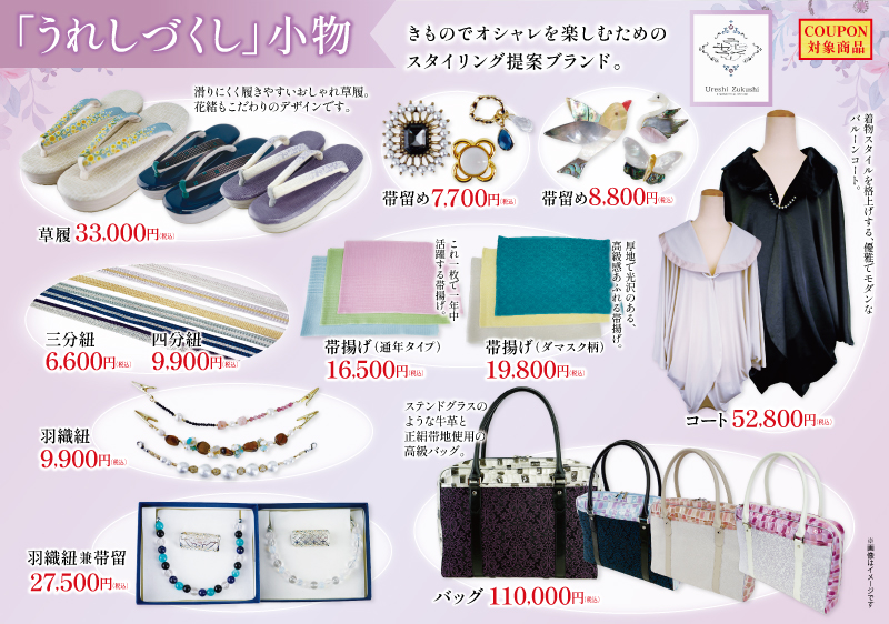 帯留め7,700円(税込)~・草履33,000円(税込)など、上質な小物を厳選しました。